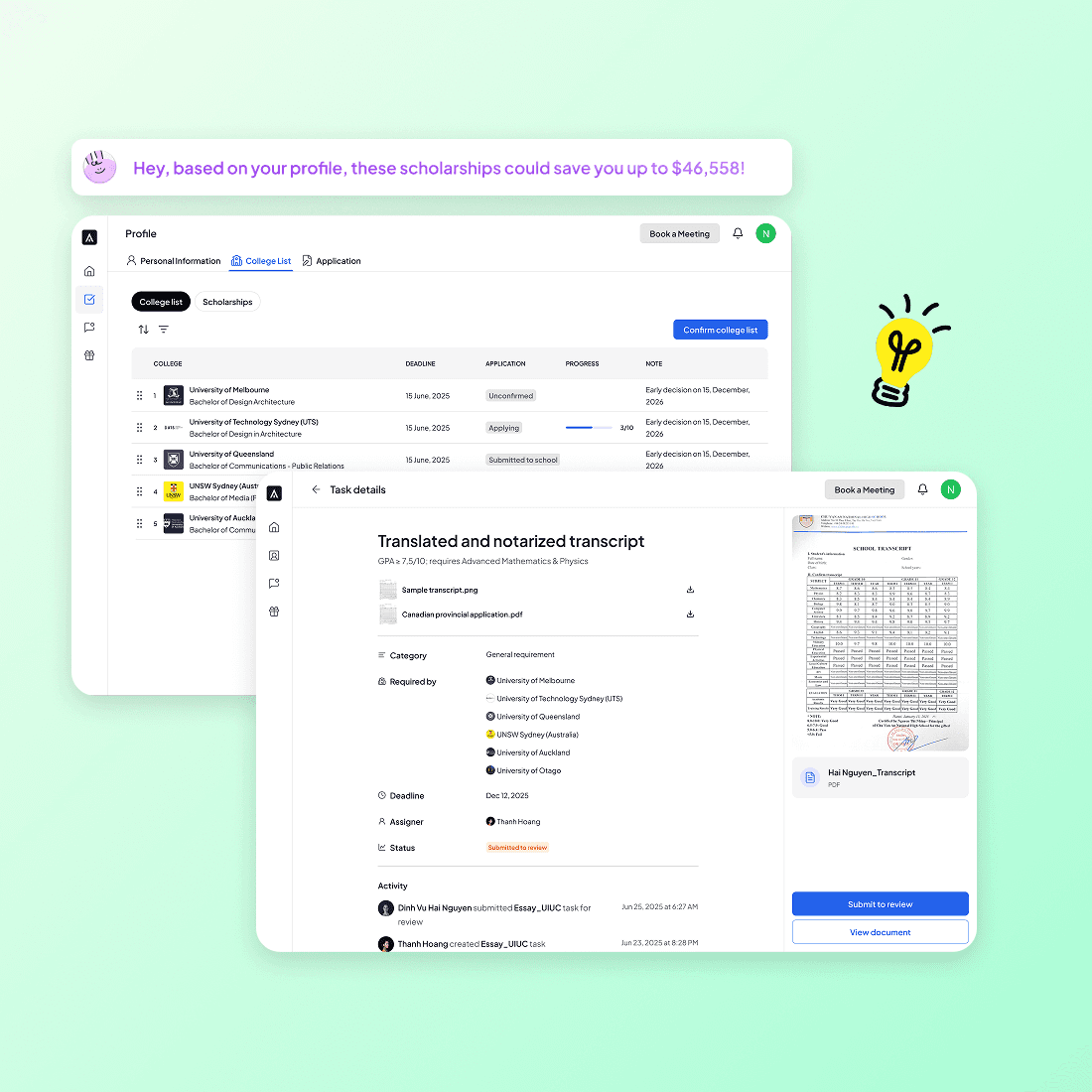 Sau khi kí hợp đồng làm việc, học viên được truy cập nền tảng Arrowster và kết nối 1-1 với mentor. Mentor sẽ lên kế hoạch cho cả hành trình (chọn trường, timeline, activities, essays).